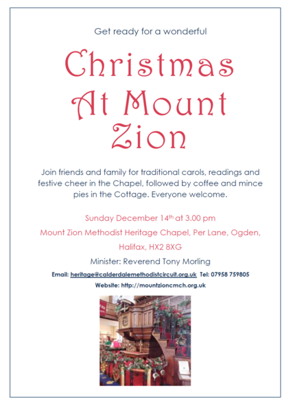 The Mount Zion annual Christmas carol service will take place on Sunday the 14th December at 3.00 pm, followed by coffee and mince pies. This year, proceedings will be led by the Reverend Tony Morling. Please join us for this traditional start to the the festive season.